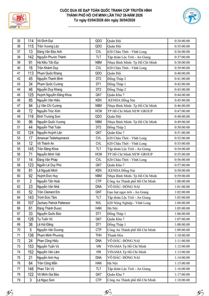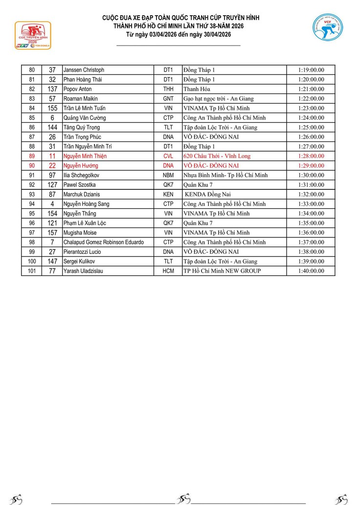 - Trong trường hợp VĐV không xuất phát hoặc không hoàn thành cự ly thì xem như không hoàn tất chặng đua.