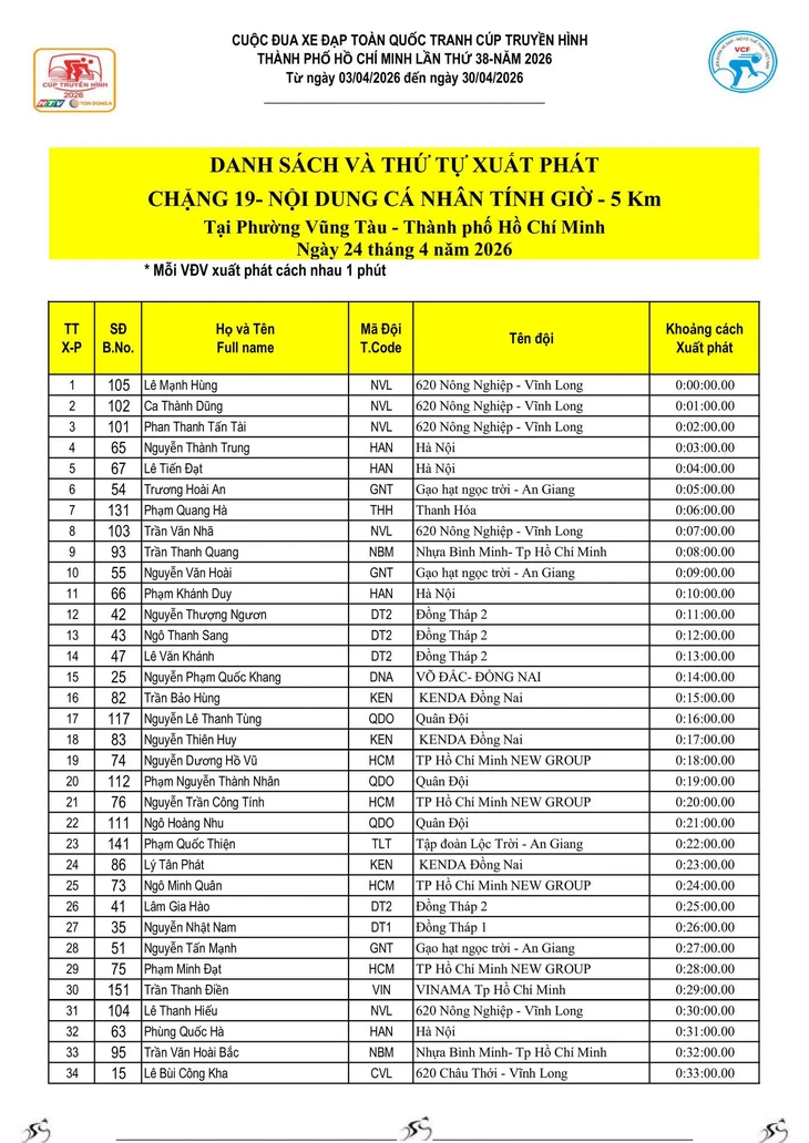 - Thành tích của chặng 19 sẽ được tính vào thành tích cá nhân của từng VĐV.
