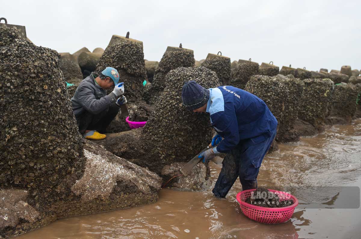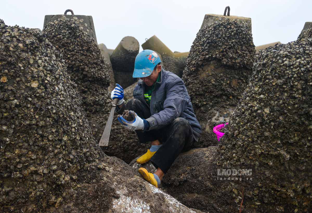 Tay nhanh thoăn thoắt cạy từng mảng vẹm bám chặt trên các khối bê tông, bà Nguyễn Thị Dung (trú xã Giao Ninh) cho biết, trời trở lạnh cũng là lúc vào mùa vẹm. Khi thủy triều rút xuống, vẹm bám dày đặc trên các khối cấu kiện bê tông chắn sóng ven biển nên rất dễ thu hoạch.