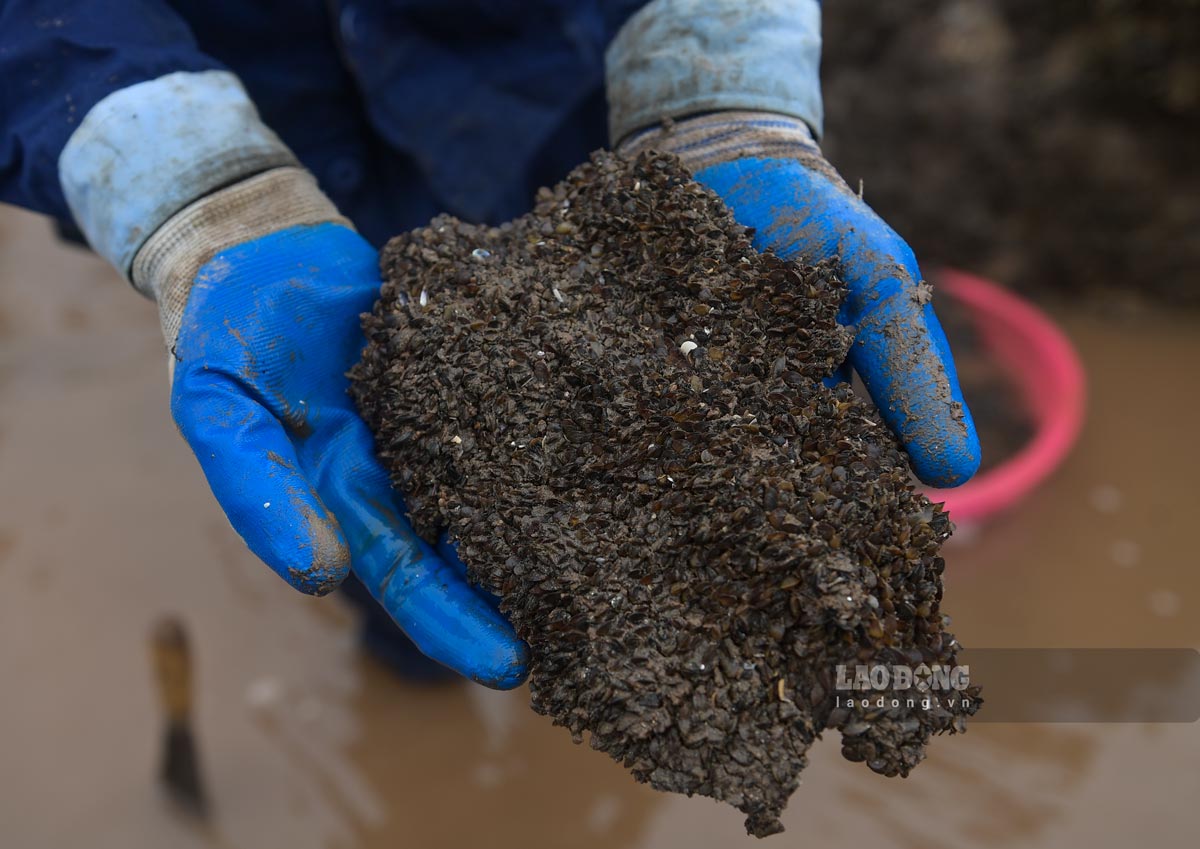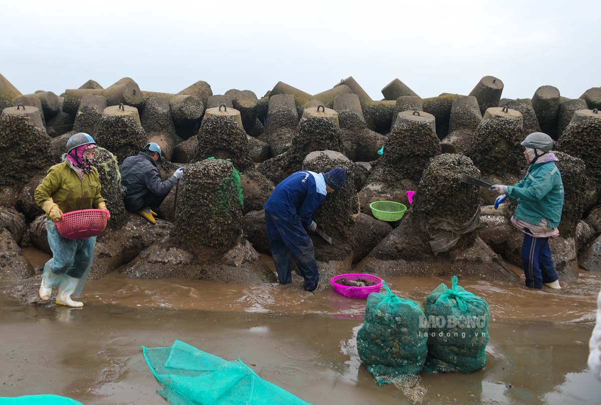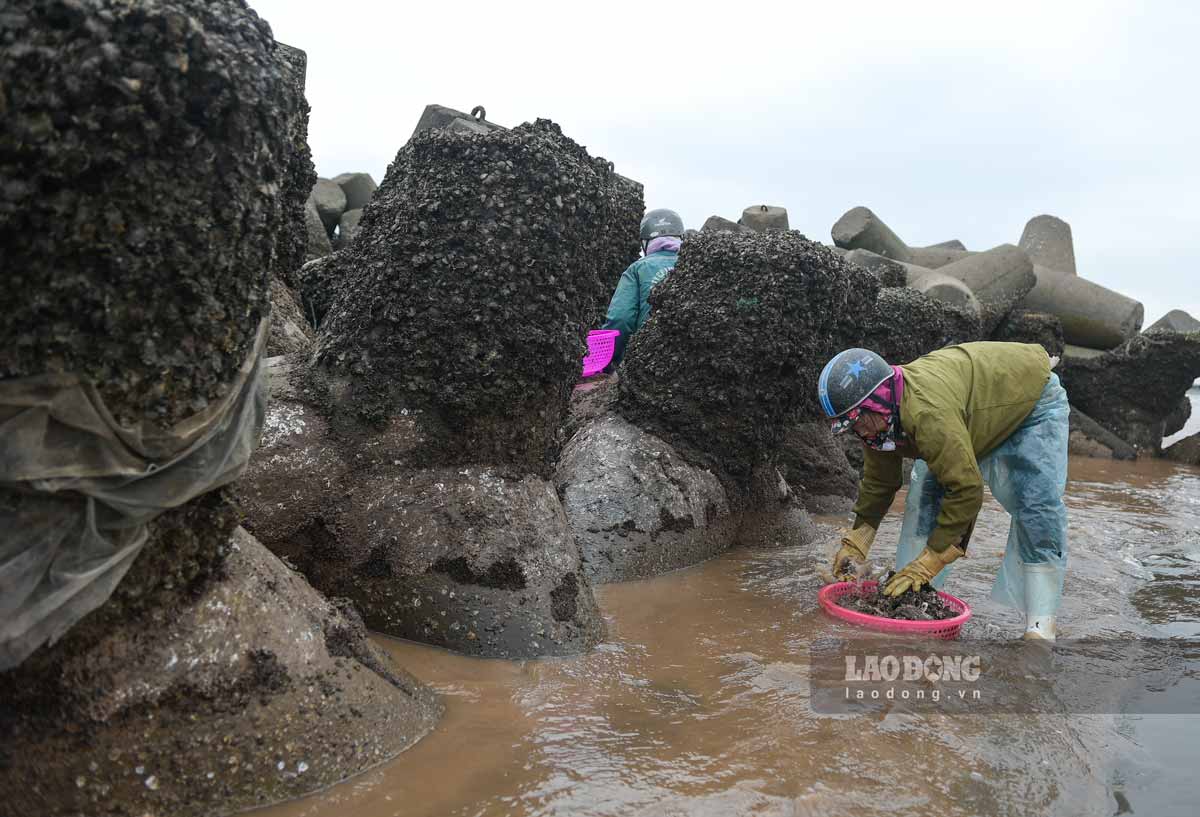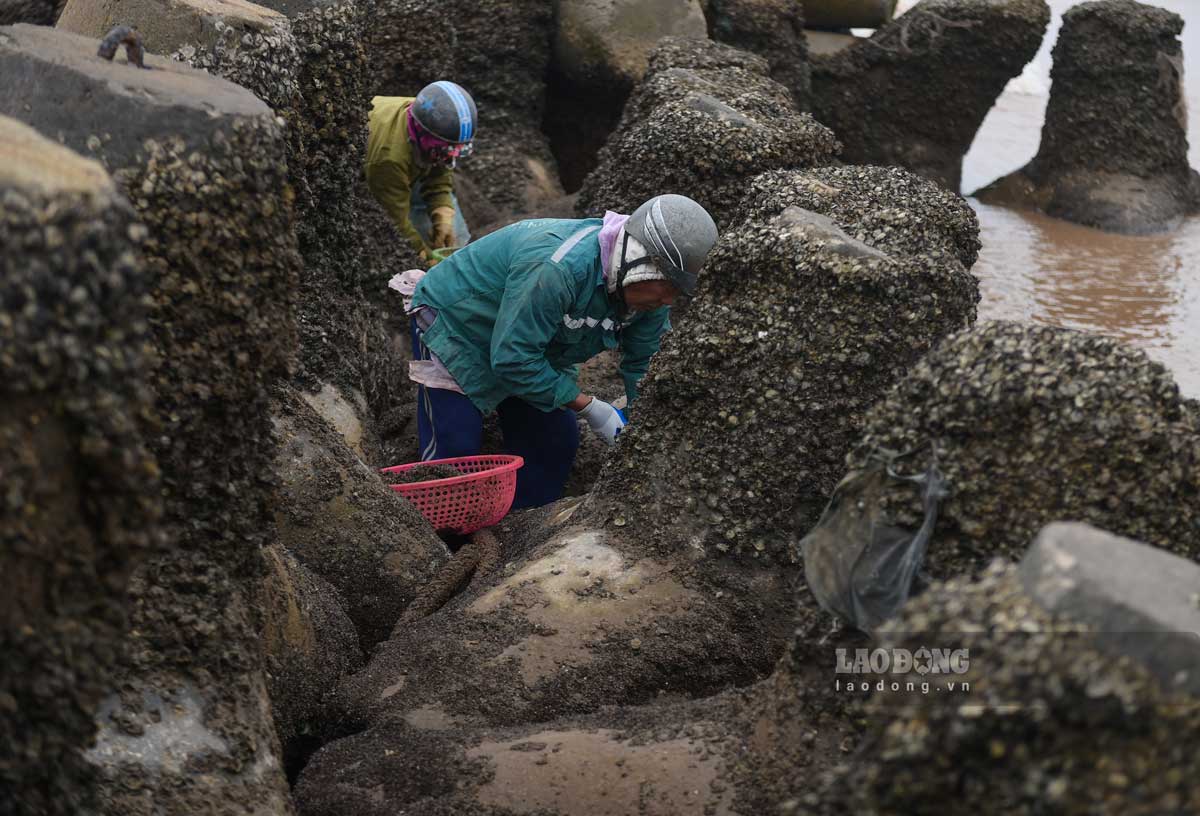 Ghi nhận của PV Báo Lao Động, khi con nước rút, từ khoảng 14h, người dân mang theo những dụng cụ thô sơ để bắt vẹm nhỏ, kiếm thêm thu nhập. Vẹm thường ở khu bãi triều, nơi có các khối bê tông chắn sóng.