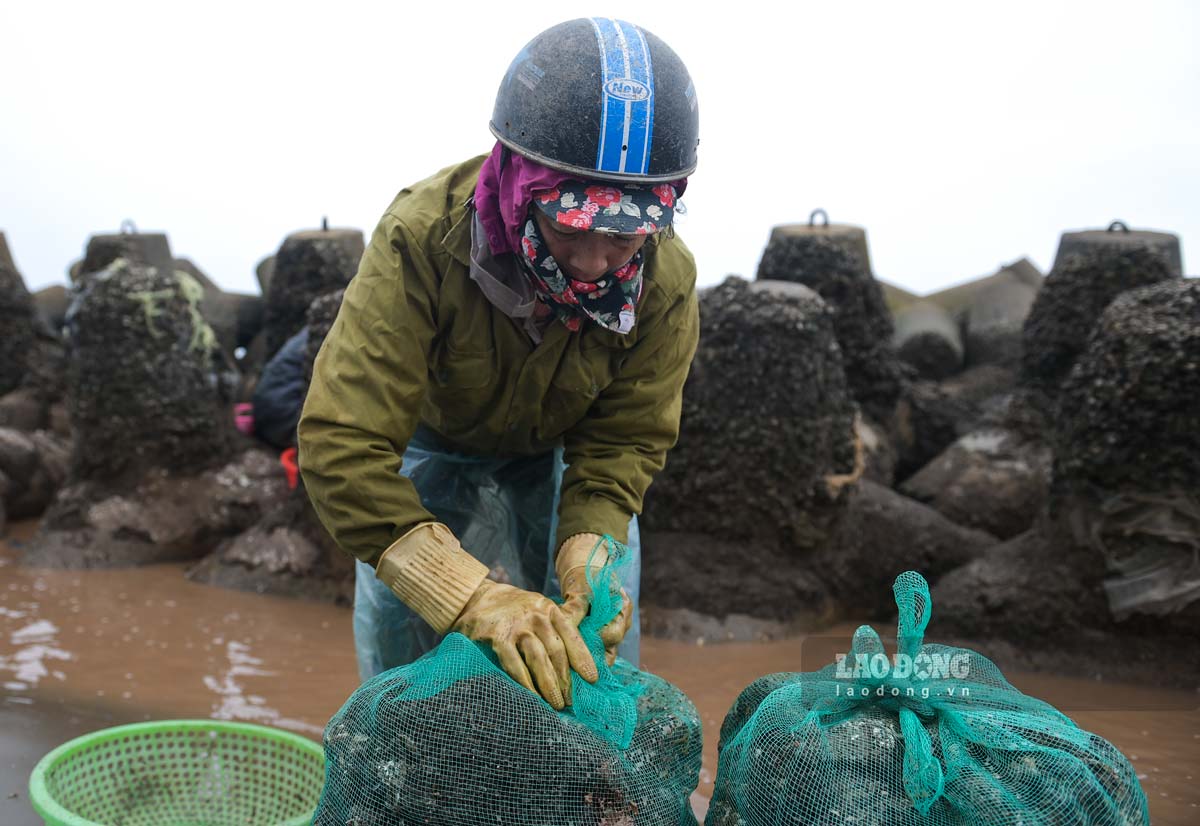 "Mùa này đi biển lạnh cắt da cắt thịt nhưng vì kiếm thêm thu nhập chúng tôi phải cố gắng đi cạy vẹm. Để giữ ấm cơ thể tôi mặc thêm áo mưa bên ngoài, đội mũ kín khăn từ đầu tới cổ và đi ủng. Hàng ngày, tôi thường ra bãi từ 14h đến 18h, thu được khoảng 10 bao vẹm", bà Dung kể.