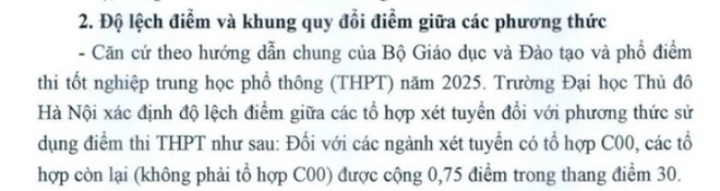 Theo tìm hiểu của Tri Thức - Znews, trong thông báo về ngưỡng đảm bảo chất lượng đầu vào và quy đổi tương đương điểm trúng tuyển giữa các phương thức (được công bố ngày 23/7), Đại học Thủ đô Hà Nội nêu rằng "Đối với các ngành xét tuyển có tổ hợp C00, các tổ hợp còn lại (không phải C00) được cộng 0,75 điểm trong thang điểm 30".