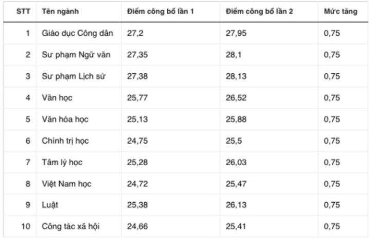 Gần 18h ngày 23/8, Đại học Thủ Đô Hà Nội bất ngờ công bố điểm trúng tuyển theo phương thức xét điểm thi tốt nghiệp THPT đối với thí sinh sử dụng tổ hợp C00 để xét tuyển vào 10 ngành. Mức điểm của những ngành này dao động từ 25,41-28,13.Điều đáng chú ý là từ trước đó, vào 9h cùng ngày, trường đã công bố điểm chuẩn của 10 ngành này với mức từ 24,66-27,38. Như vậy, điểm chuẩn mới đã tăng 0,75 so với thông báo cũ.