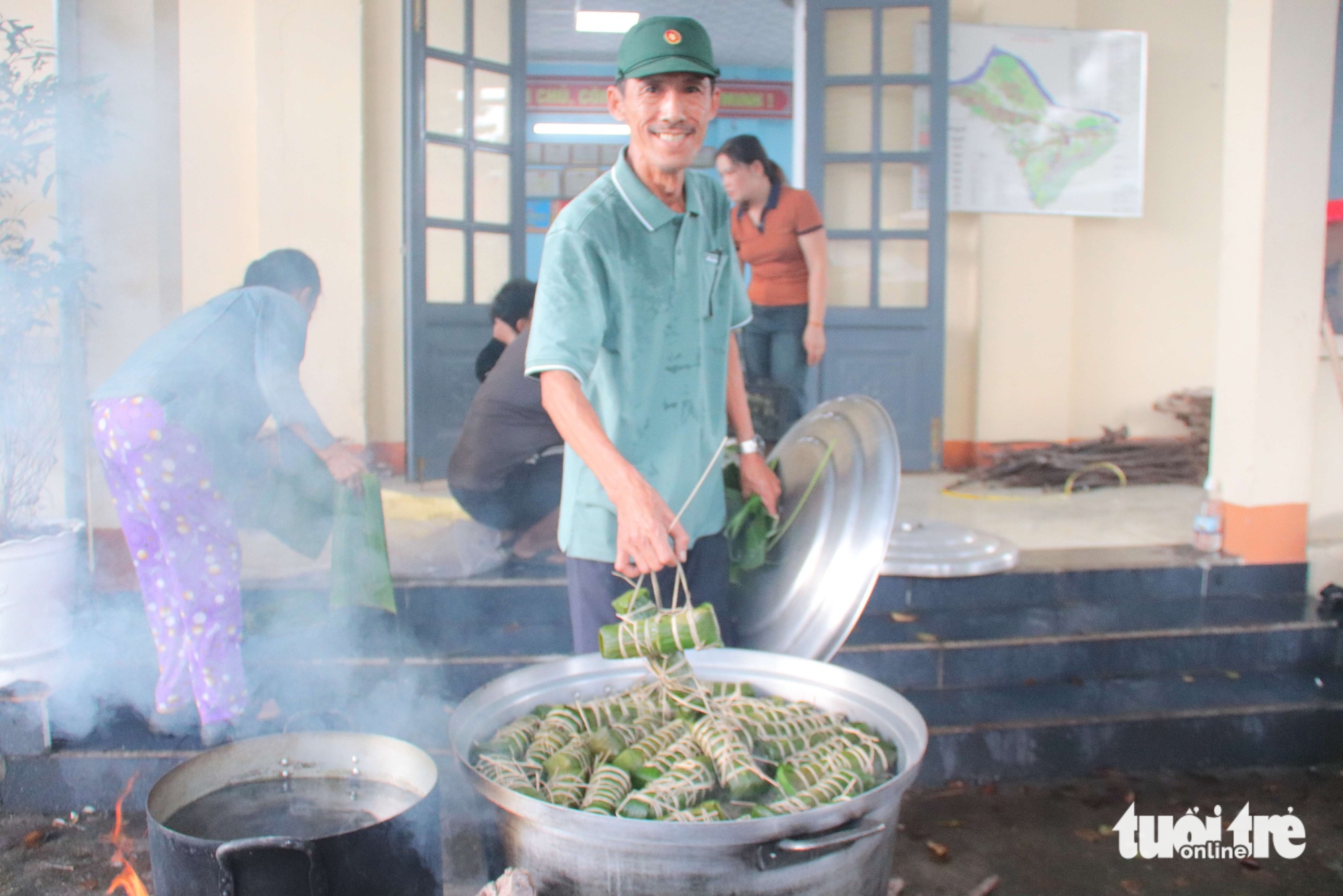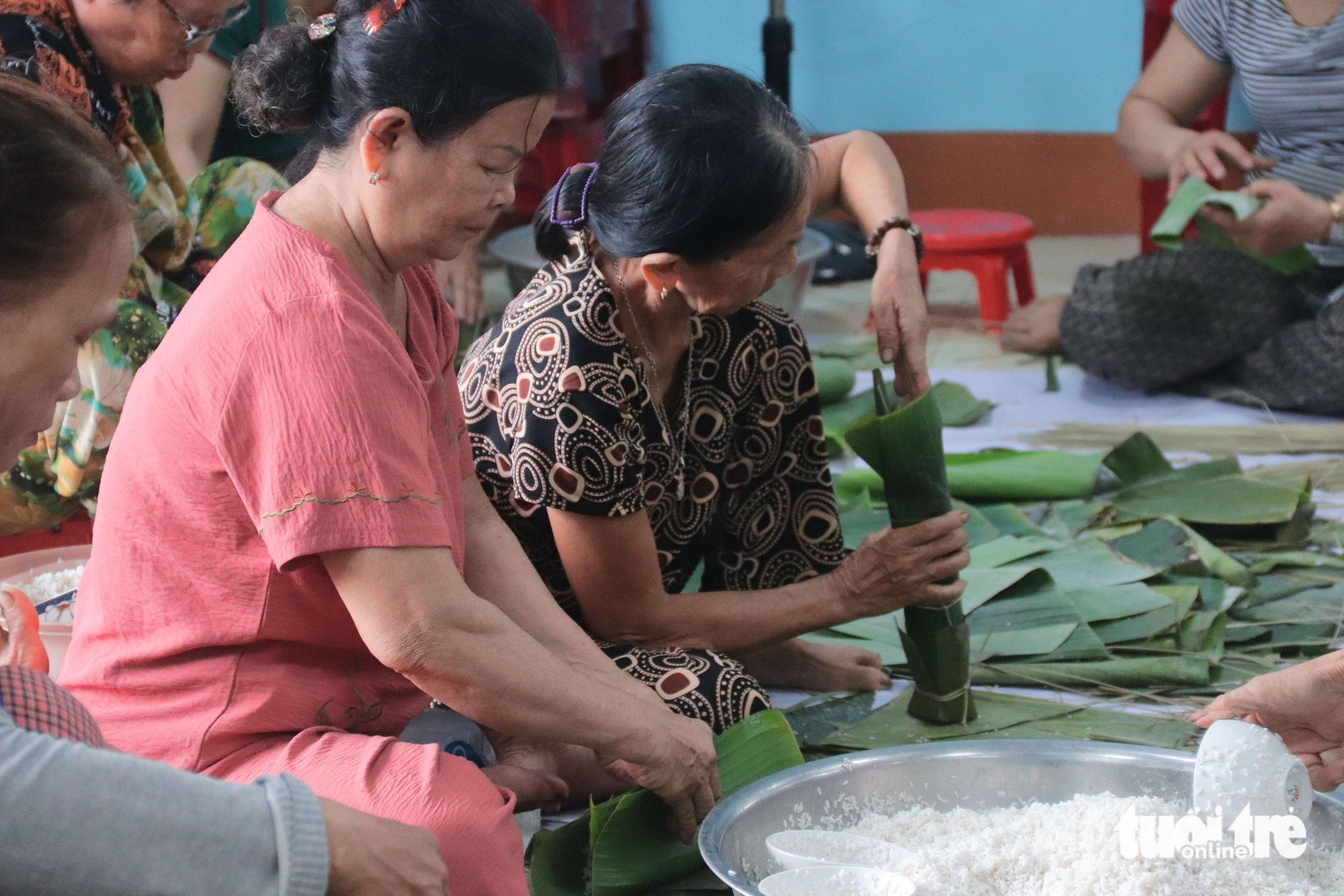 Từ phụ nữ, cựu chiến binh đến các bạn thanh niên đều tham gia gói bánh - Ảnh: THANH THÙY
