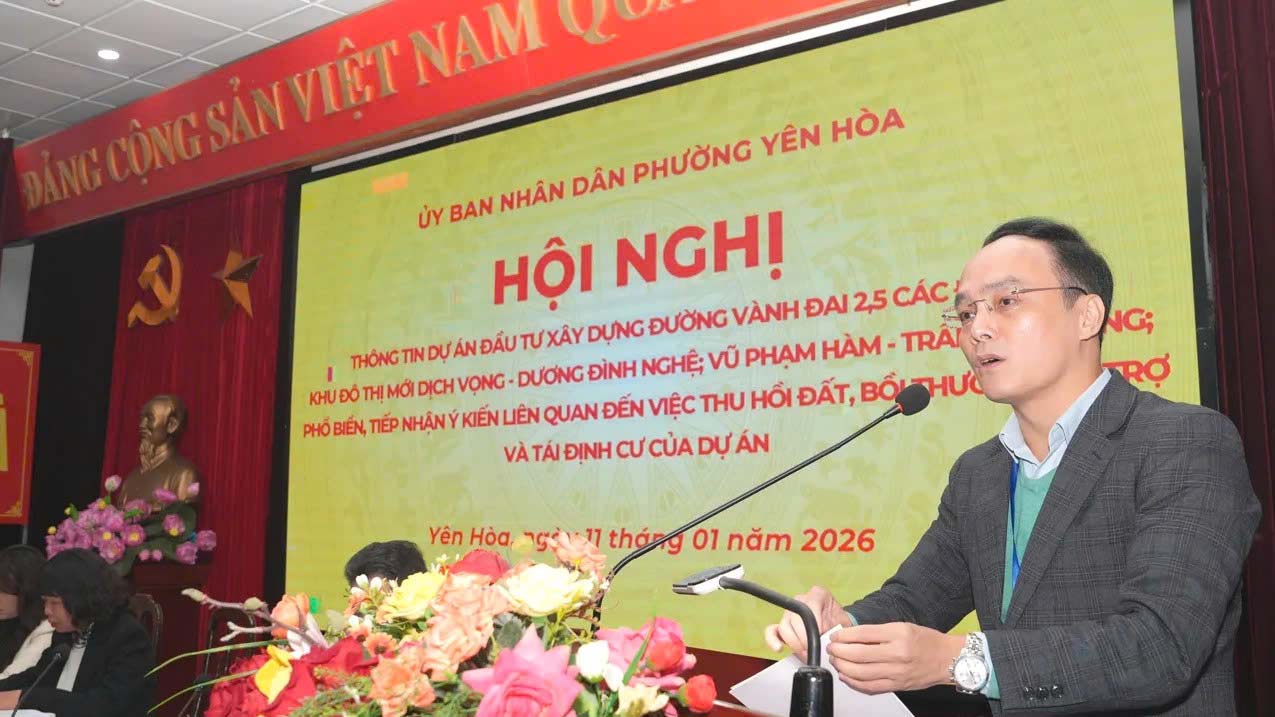 Ngày 11.1, UBND phường Yên Hòa (Hà Nội) tổ chức Hội nghị thông tin dự án đường Vành đai 2,5 các đoạn Khu đô thị mới Dịch Vọng - đường Dương Đình Nghệ; Vũ Phạm Hàm - Trần Duy Hưng; phổ biến, tiếp nhận ý kiến liên quan đến việc thu hồi đất, bồi thường, hỗ trợ tái định cư của dự án.