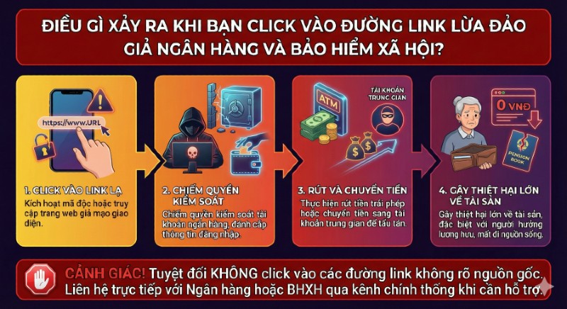 Theo Công an Nghệ An, các đường link này thực chất là liên kết độc hại, được thiết kế giống thông báo chính thức của ngân hàng hoặc bảo hiểm xã hội. Khi người dân đăng nhập, thông tin sẽ bị đánh cắp, tạo điều kiện để các đối tượng chiếm quyền kiểm soát tài khoản ngân hàng, rút tiền, chuyển tiền sang tài khoản trung gian, gây thiệt hại lớn về tài sản, đặc biệt với người hưởng lương hưu.