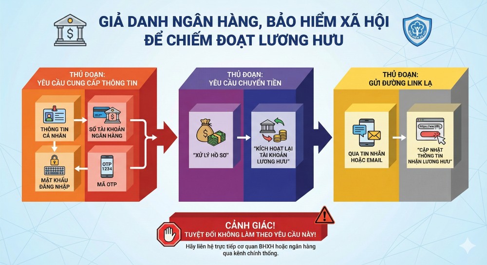 Cơ quan chức năng cho biết, thủ đoạn phổ biến là yêu cầu nạn nhân cung cấp: Thông tin cá nhân; Số tài khoản ngân hàng; Mật khẩu đăng nhập; Mã OTP; Hoặc yêu cầu chuyển tiền với lý do “xử lý hồ sơ”, “kích hoạt lại tài khoản lương hưu”.