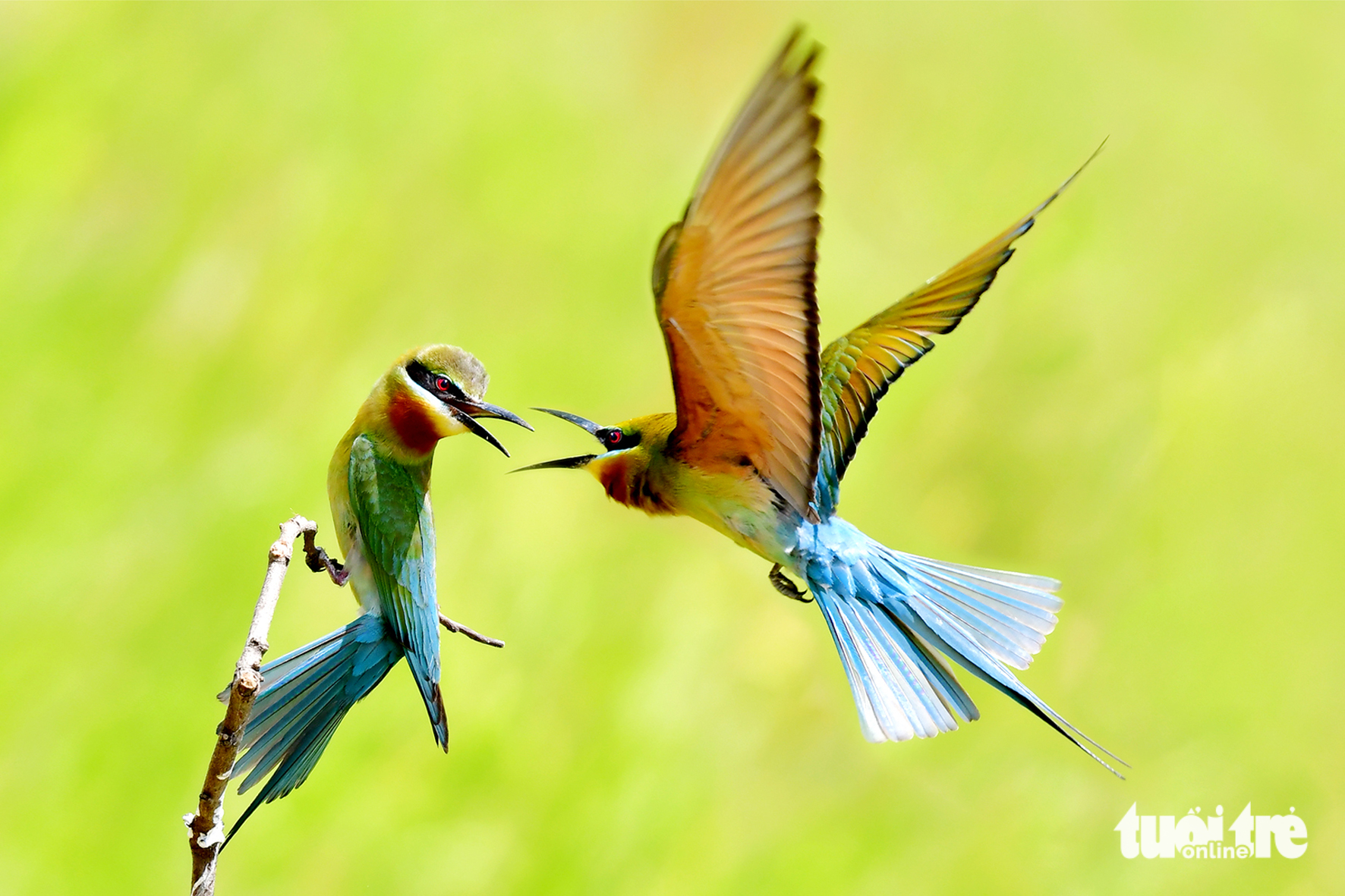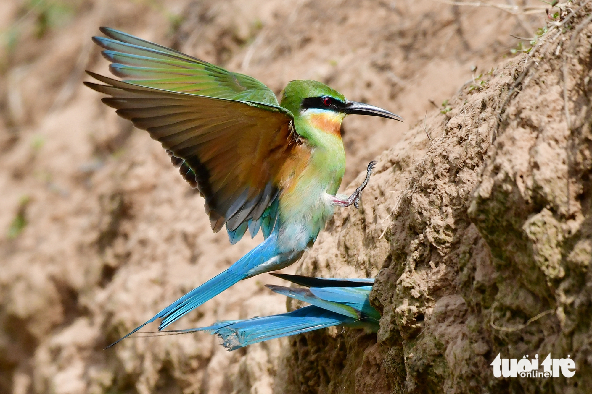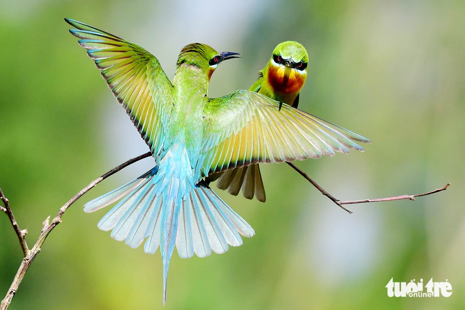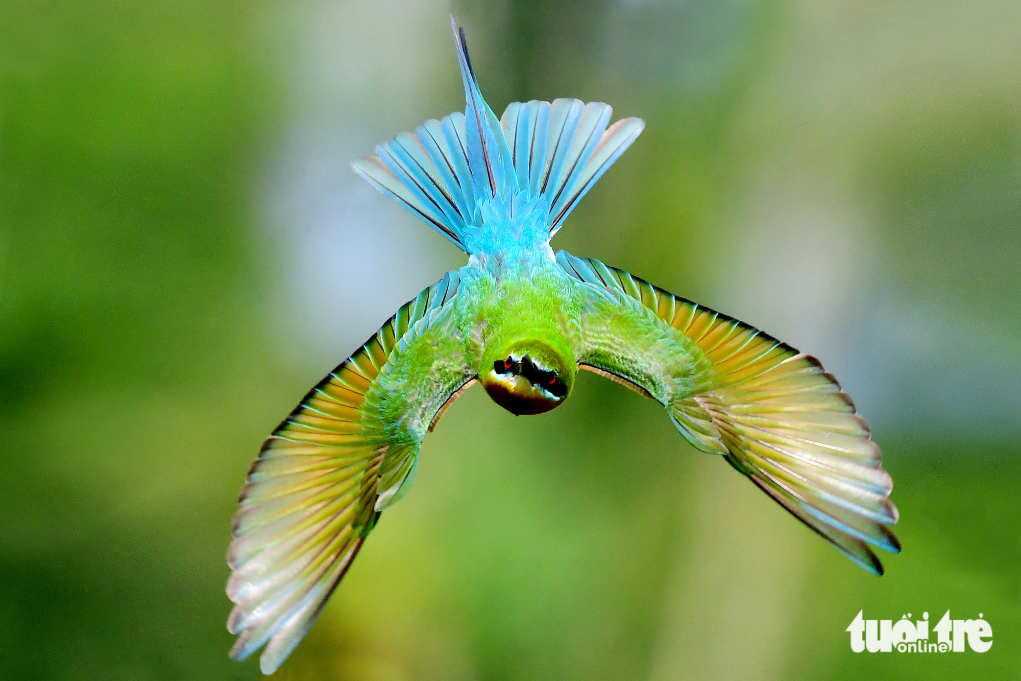 Khi tung cánh, chim trảu đuôi xanh để lộ ra bộ lông rực rỡ sắc màu. Dưới ánh nắng mặt trời, đôi cánh xòe rộng bay lượn càng thêm ấn tượng.