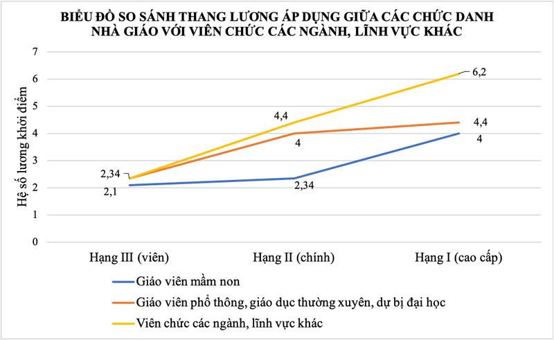 Hệ số khởi điểm của giáo viên mầm non hạng I là 4,0 trong khi các chức danh hạng I của viên chức ngành khác khác là 6,2 (cao gấp khoảng 1,55 lần).