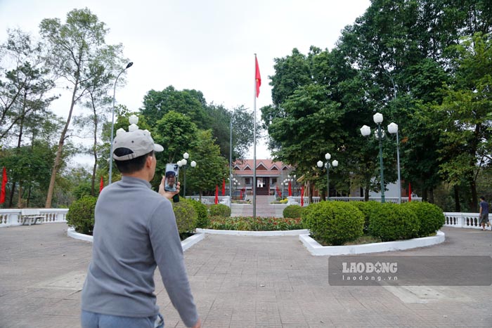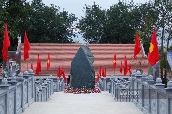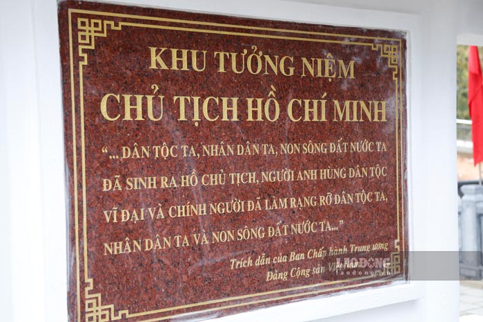 Từ Nhà trưng bày đi lên Nhà tưởng niệm có bố trí chiếu nghỉ và đặt bia di tích là một phiến đá tự nhiên. Trên bia di tích trích dẫn lời dạy của Chủ tịch Hồ Chí Minh: “Đoàn kết, đoàn kết, đại đoàn kết. Thành công, thành công, đại thành công”.