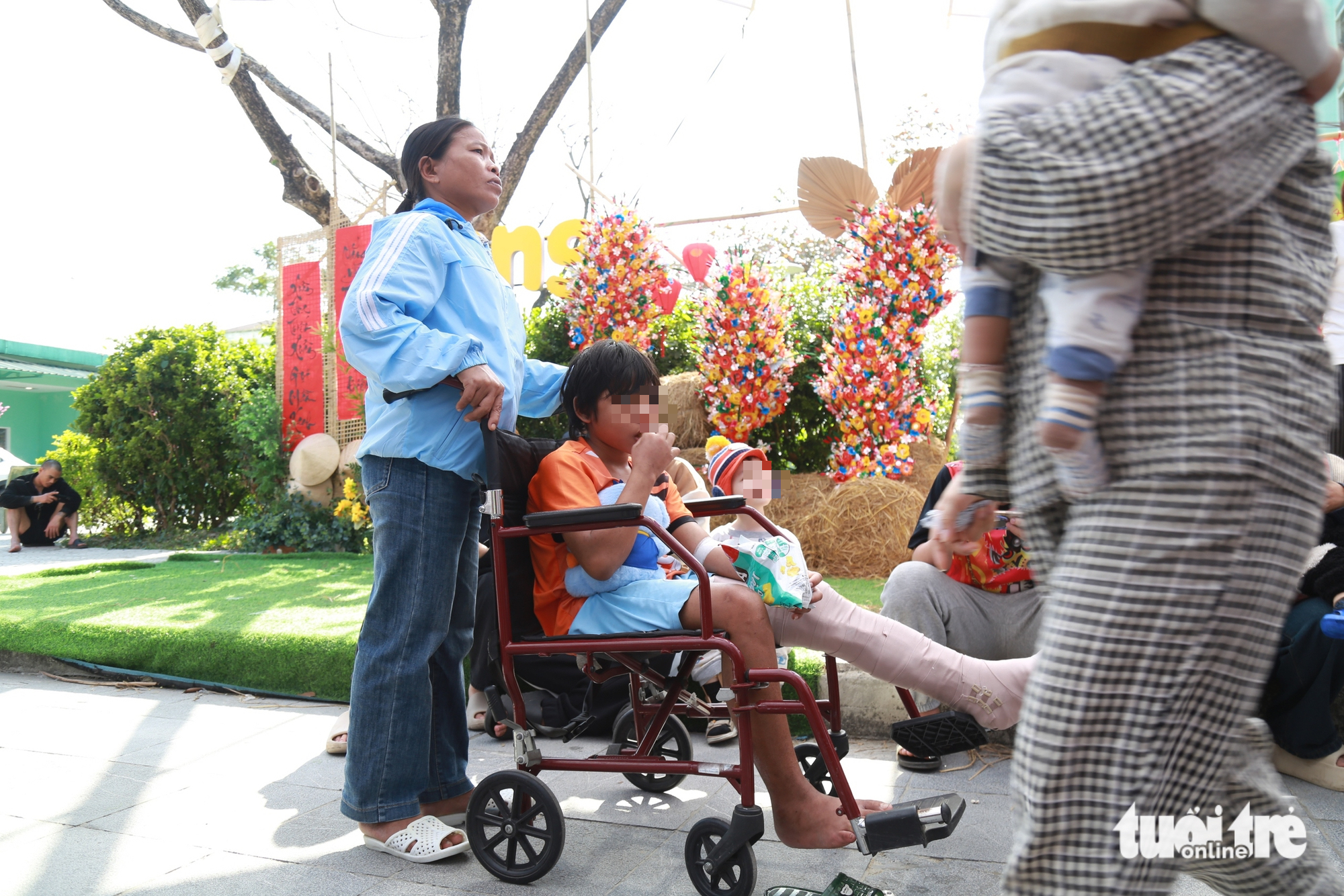 "Nhà tôi năm nay không có Tết, chỉ lo cho con nằm viện, không sắm sửa gì. Được bệnh viện tặng hai phiếu mua quà Tết, mừng lắm. Tôi đẩy xe lăn đưa con xuống chợ, thấy con cười là quên hết mệt", chị A nói, tay vẫn giữ chặt chiếc xe lăn của con.