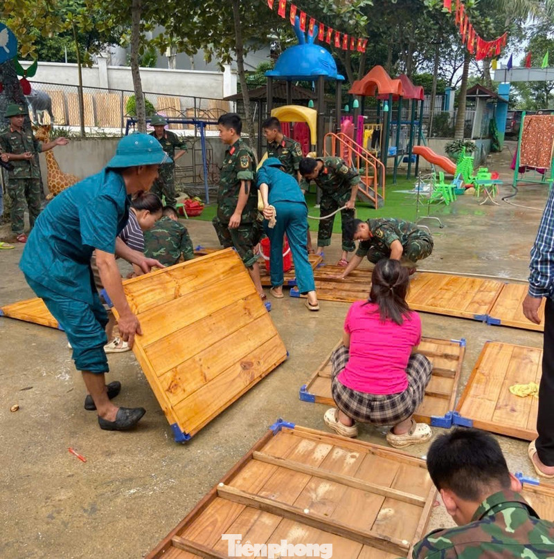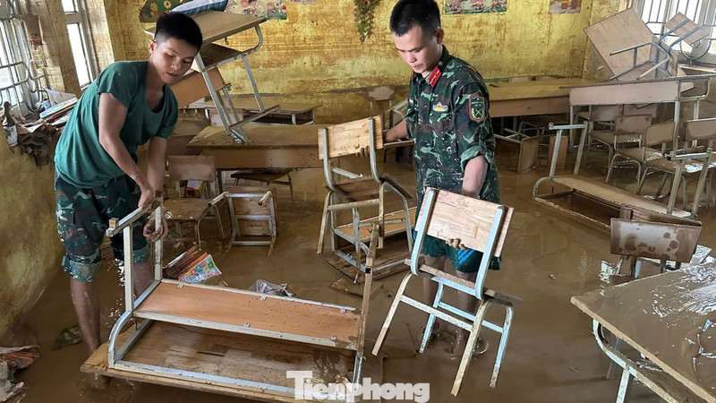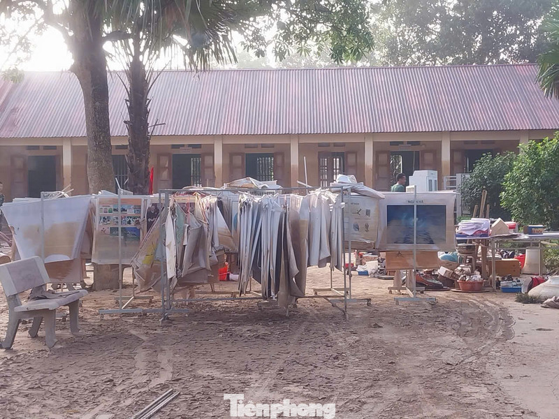 Ngoài việc dọn dẹp bùn đất, vệ sinh trường lớp, sân trường, kê dọn đồ đạc; Bộ đội cùng thầy cô giáo và các em học sinh còn mang “những con chữ” sách, vở ra phơi nắng rất khẩn trương, háo hức chờ ngày trở lại lớp học.