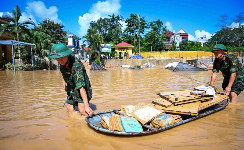 Sáng 11/10, tại các trường học bậc mầm non, THCS ở xã Yên Bình, hơn 100 cán bộ, chiến sỹ thuộc Ban Chỉ huy phòng thủ khu vực 3 Nhân Lý phối hợp với thầy cô giáo tiến hành các công việc dọn dẹp, quét bùn, kê kích đồ đạc, tổng vệ sinh. Sách vở, tài liệu, thiết bị dạy học được đưa ra sân phơi khô dưới nắng sau nhiều ngày mưa lũ với không khí làm việc khẩn trương. Thiếu tá Mông Thế Tài, Trợ lý Ban Chỉ huy phòng thủ khu vực 3 Nhân Lý cho biết: Khi xuất hiện lũ bao vây, xã Yên Bình bị ngập sâu, chia cắt, lực lượng Quân đội đã thành lập các tổ, đội công tác đến cứu giúp nhân dân sơ tán người và tài sản đến nơi an toàn. Khi lũ rút, cán bộ chiến sỹ tiếp tục đưa nhu yếu phẩm cho các thầy cô giáo và các em học sinh, đồng thời tổng vệ sinh, lau chùi bàn ghế, sách vở để các em sớm ổn định, học tập trở lại.