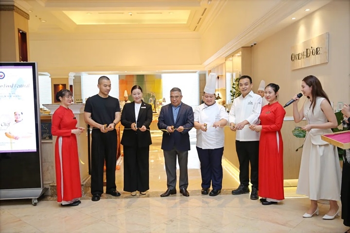 Đại sứ Philippines tại Việt Nam Meynardo Los Banos Montealegre và các đại biểu cắt băng khai mạc Tuần lễ ẩm thực Philippines tháng 6/2025. (Ảnh: Ánh Kim)