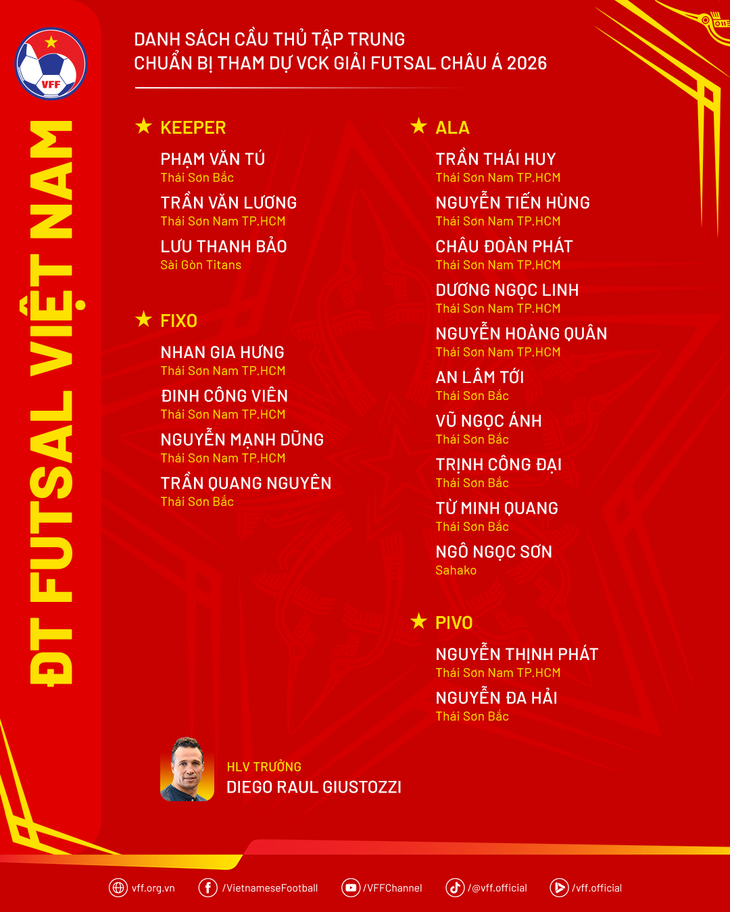 Ngày 29-12, HLV Diego Giustozzi đã công bố danh sách tập trung đội tuyển futsal Việt Nam nhằm chuẩn bị cho vòng chung kết futsal châu Á 2026.