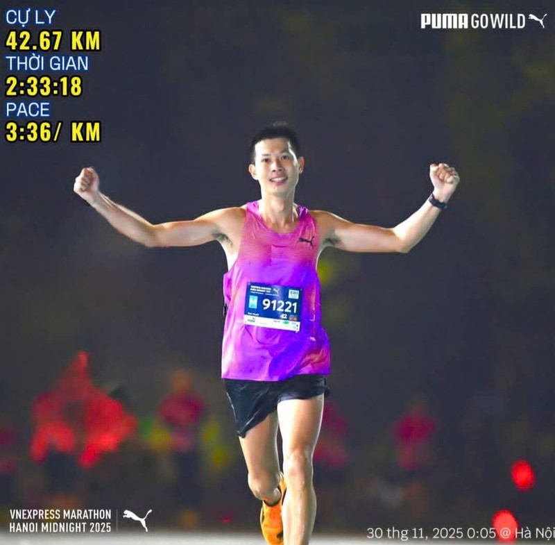 Chỉ trong một tuần, anh hai lần tự phá kỷ lục của chính mình: 2:33:44 ở Ha Long Heritage Marathon, rồi 2:33:18 ở giải Chạy Đêm Hà Nội – minh chứng sống động rằng tuổi tác không thể níu bước chân của một trái tim tràn đầy nhiệt huyết.