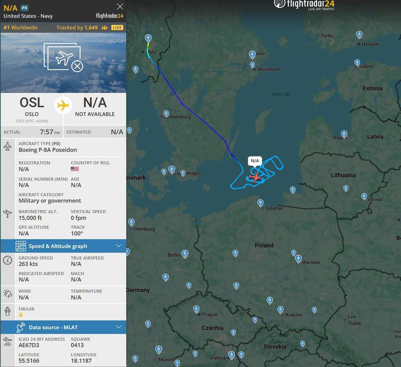 Trích dẫn dữ liệu theo dõi chuyến bay từ Flightradar24, tài khoản Osinttechnical chỉ ra rằng Hải quân Mỹ đã điều một trong những máy bay P-8 có mặt tại Oslo đến Biển Baltic, gần vùng lãnh thổ Kaliningrad của Nga.