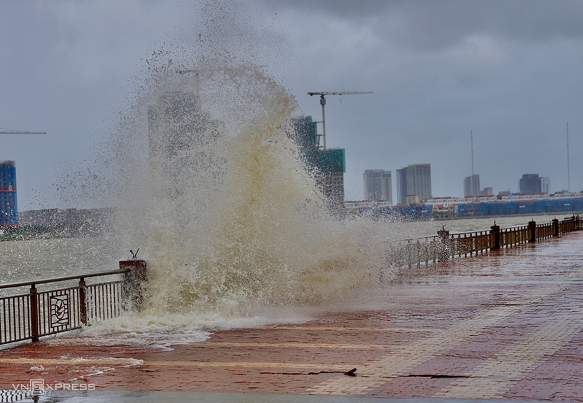 Cứ khoảng 1-2 phút, từng đợt sóng ngoài cửa sông Hàn lại ồ ạt đánh vào vỉa hè, tạo cột nước tung cao khoảng 4-6 m. Nước tràn xuống đường Như Nguyệt, gây ngập khoảng 0,4 m, dài hơn 100 m. Một số đoạn vỉa hè bắt đầu bị bong tróc.