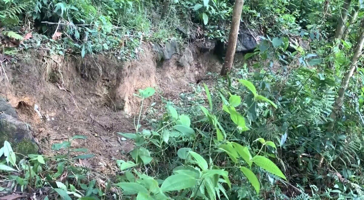 Điểm thứ 2 nằm trên sườn núi có độ dốc 45%, khảo sát cho thấy có vết nứt đất ngang sườn núi, chiều dài khoảng 100 m, rộng 0,6m, chiều sâu khoảng 1m. Khu vực xung quanh vết nứt có nhiều tảng đá lớn nằm rải rác, nếu xảy ra sạt lở, đất đá sẽ lăn xuống khu dân cư.