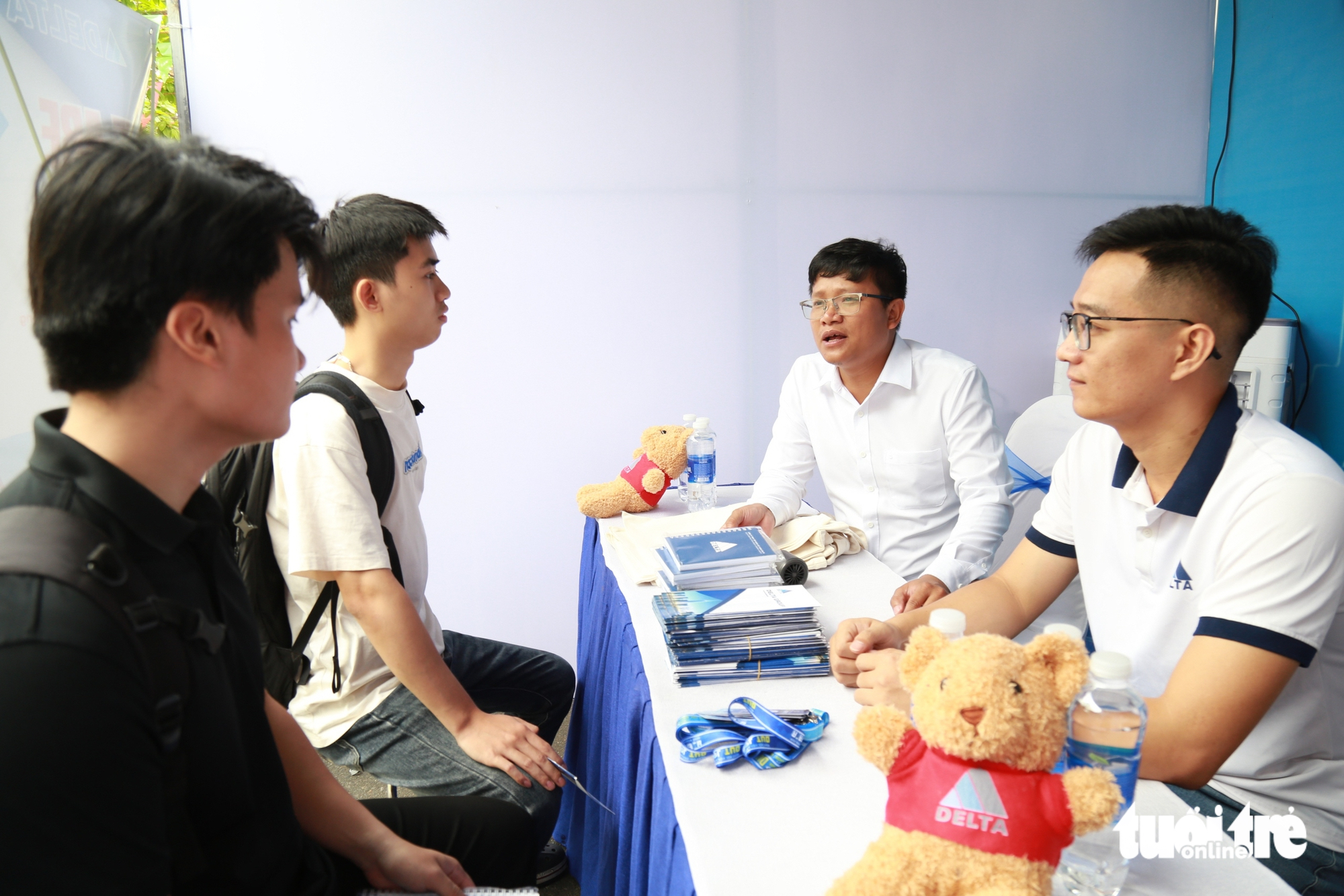 Các gian hàng tuyển dụng liên tục đông người, sinh viên xếp hàng để gặp gỡ, trao đổi trực tiếp với nhà tuyển dụng và tham gia phỏng vấn ngay tại chỗ.