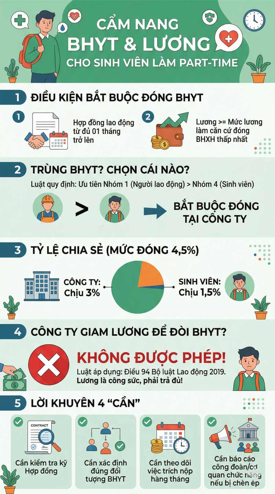 | Quyền lợi & Nghĩa vụ tiền lương | Không được giam lương để cưỡng ép nộp BHYT (Điều 94 BLLĐ 2019) | Trách nhiệm đóng phần 1,5% để nộp về cơ quan BHXH (nếu công ty chưa trừ) |