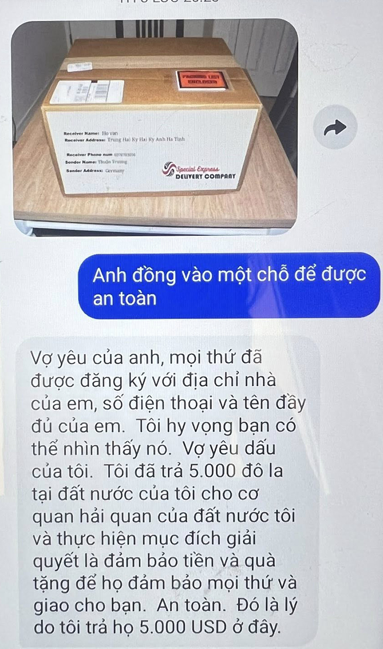 Hôm nay, người này nhắn tin thông báo đã gửi 50.000 USD, đóng gói trong hộp carton, sẽ chuyển từ nước ngoài về. Để nhận được quà, người phụ nữ phải chuyển 5.000 USD (hơn 130 triệu đồng) vào tài khoản ngân hàng tên VO VAN SACH để làm "chi phí hải quan".