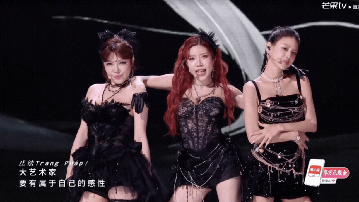 Trang Pháp gây ấn tượng ngay từ khoảnh khắc mở màn khi treo mình trên không, xuất hiện trong bộ váy trắng cùng đôi cánh ma mị đầy cuốn hút. Đặc biệt, màn "lột xác" khi cả nhóm đồng loạt chuyển sang trang phục đen ôm sát trở thành điểm nhấn của tiết mục.