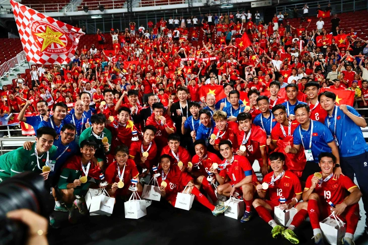 Các thành viên ban huấn luyện và cầu thủ U22 cùng lãnh đạo Liên đoàn Bóng đá Việt Nam (VFF) sẽ cùng mang HCV SEA Games 33 về nước.