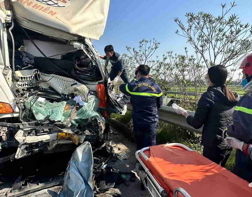 Cú va chạm mạnh làm phần đầu xe ô tô tải chở hàng bị hư hỏng nặng, khung cabin biến dạng, cửa xe bị kẹt. Lái xe bị đa chấn thương, bất tỉnh và mắc kẹt trong cabin, không thể tự thoát ra ngoài.