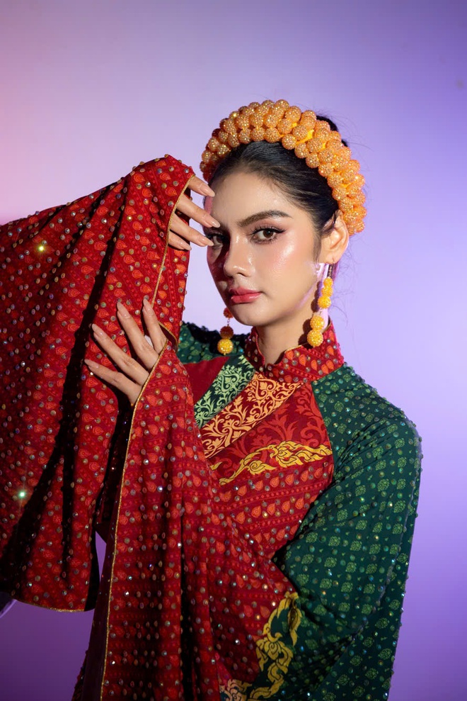 Về màu sắc, nhà thiết kế Việt Hùng sử dụng gam màu đỏ gạch, vàng đất, nâu sẫm và xanh ngọc… gợi nhớ sắc màu của những đền tháp Chăm cổ. Những tông màu này còn mang đến cho thiết kế áo dài sắc thái trầm ấm, cổ điển nhưng vẫn sang trọng và hiện đại.