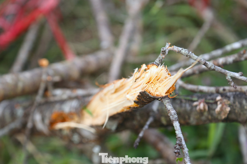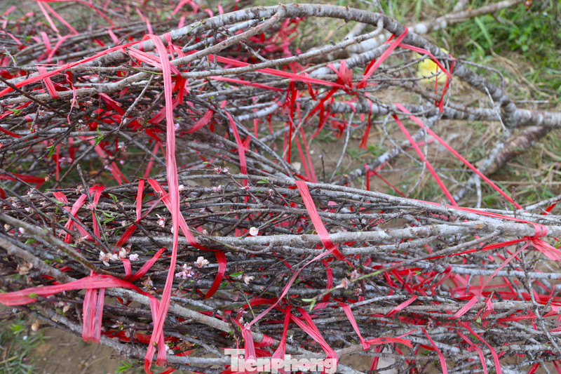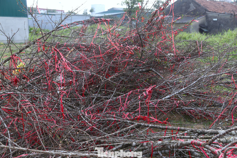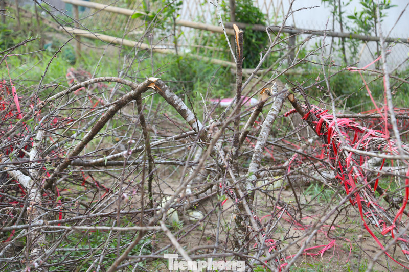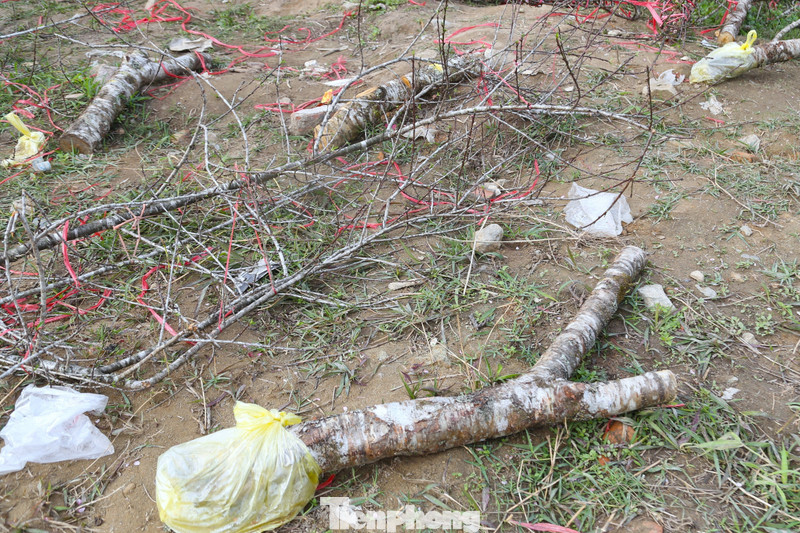 Có cành đào đã bị cưa, có cành bị bẻ gãy nằm lẫn lộn, ngổn ngang với dây buộc.