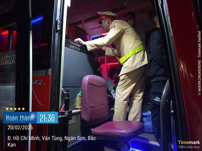 Lúc 21h35 ngày 20/2, tại Km100 đường Hồ Chí Minh, tổ công tác của Phòng CSGT đã dừng và tiến hành kiểm tra ô tô khách BKS 35F-002.xx. Tại thời điểm kiểm tra, tổ công tác xác định trên xe chở 63 người/43 chỗ.