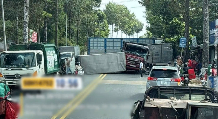 Xe ben còn va trúng một xe tải chạy chiều ngược lại khiến xe này bị rách thùng xe.