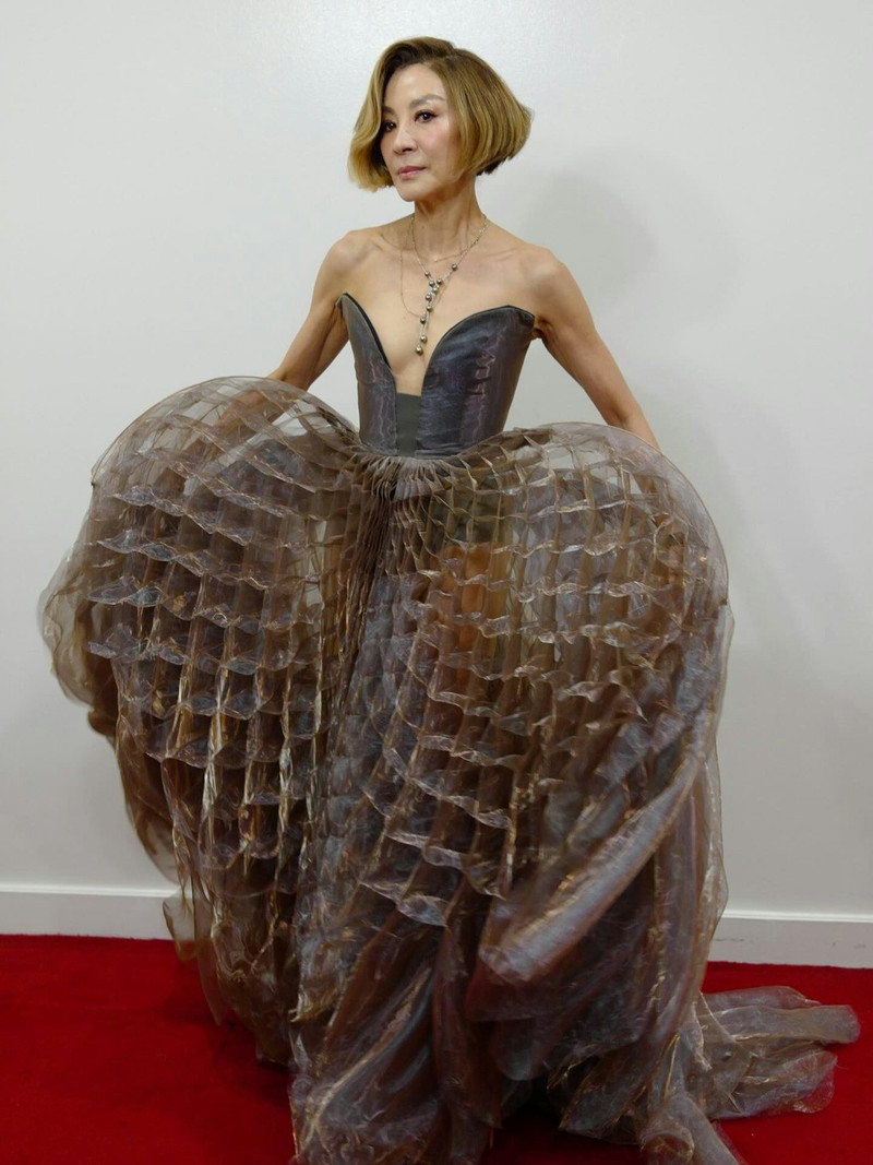Tại sự kiện, đả nữ sinh năm 1962 mặc váy cúp ngực màu nâu của nhà thiết kế Hà Lan Iris van Herpen. Chiếc váy có kiểu dáng lạ mắt. Thân trên may thành dạng corset (áo nịt ngực), ôm sát cơ thể kết hợp xẻ sâu táo bạo. Trong khi đó, chân váy bồng bềnh, với những nếp gấp 3D lập thể khá trừu tượng.