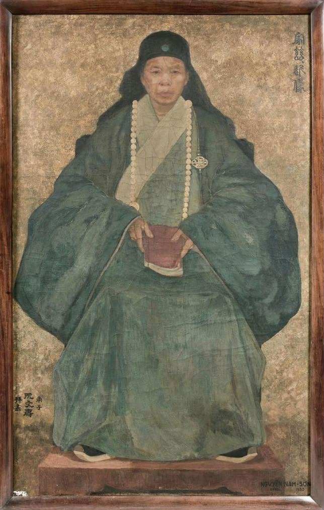 Nhà nghiên cứu Ngô Kim Khôi cho rằng tinh thần phương Đông thể hiện trong cách tổ chức không gian: sự đối xứng, tư thế trực diện và ánh nhìn nghiêm nghị của nhân vật. Tuy nhiên ông Nam Sơn đã kết hợp phương pháp tạo hình hiện đại được tiếp thu từ họa sĩ Pháp Jean-Pierre Laurens, nhất là kỹ năng sử dụng sơn dầu để diễn tả chất liệu, khối và ánh sáng.