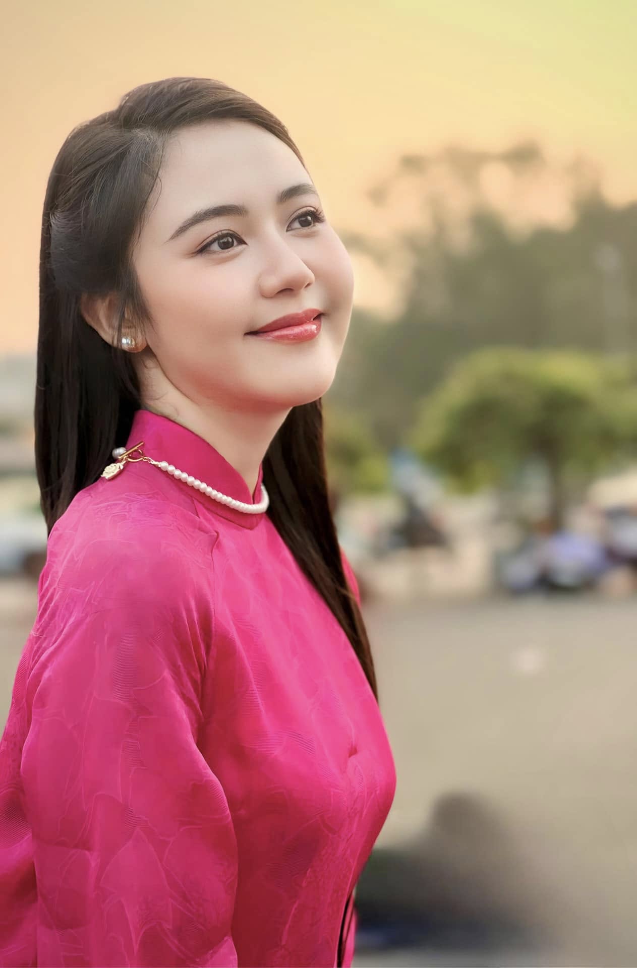 | Mỹ Dung khoe vẻ đẹp nền nã khi diện áo dài. Cô được nhận xét đậm chất miền Tây với nước da trắng, gương mặt tròn, đôi mắt to và nụ cười hiền hậu. |