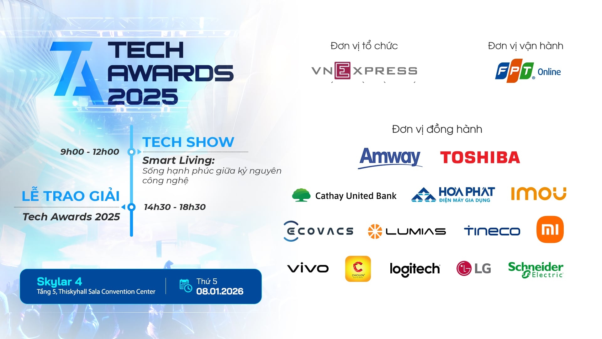 Chương trình năm nay diễn ra từ 9h đến 18h30 ngày 8/1. Buổi sáng là hoạt động Tech Show cập nhật nhiều kiến thức và xu hướng, cách sử dụng sản phẩm. Buổi chiều là lễ trao giải cho 16 hạng mục thuộc bốn nhóm nội dung, gồm Ứng dụng (3 hạng mục), Thiết bị (6 hạng mục), Thương hiệu (6 hạng mục) và một hạng mục riêng cho nhà sáng tạo nội dung công nghệ.