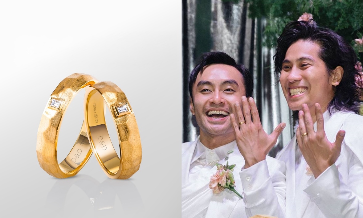 Trong ngày vui, VJ Dustin Phúc Nguyễn và người mẫu Dyon chọn nhẫn thiết kế độc bản từ kỷ vật của mẹ. Không đi theo mô tuýp quen thuộc, món trang sức ghi điểm với bề mặt thô mộc - tượng trưng cho những điều "không hoàn hảo" nhưng hòa quyện khi đi cạnh nhau.