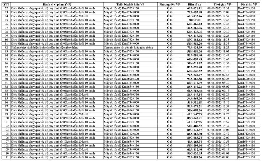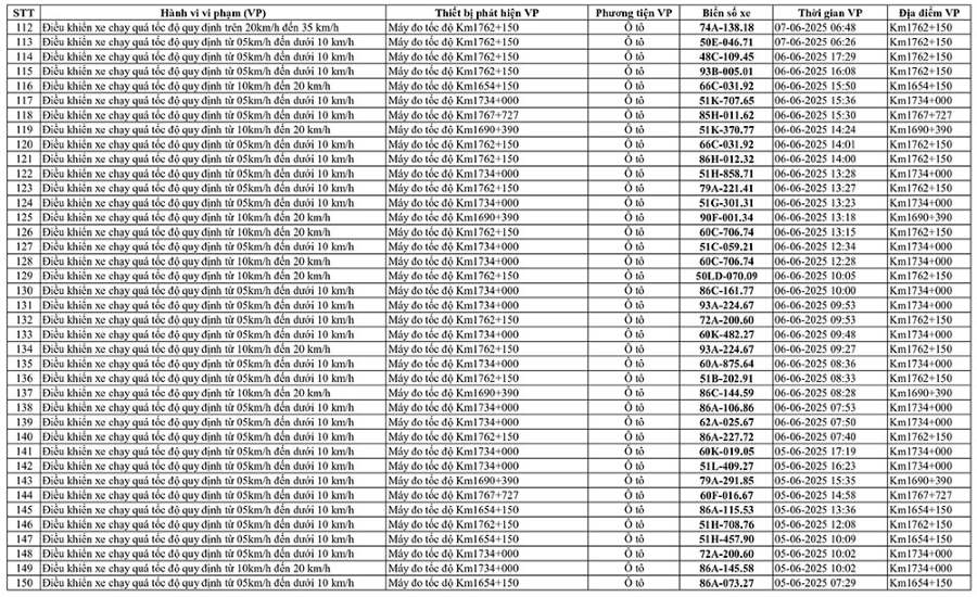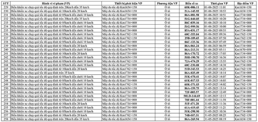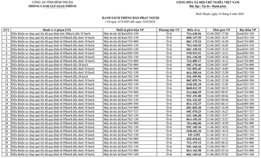 Ngày 17.6, Phòng CSGT Công an tỉnh Bình Thuận cho biết, từ ngày 31.5 đến 14.6.2025, qua Hệ thống giám sát - xử lý vi phạm trật tự, an toàn giao thông trên tuyến Quốc lộ 1 qua tỉnh Bình Thuận đã ghi nhận, phát hiện 258 phương tiện vi phạm tốc độ, không chấp hành đèn tín hiệu giao thông.