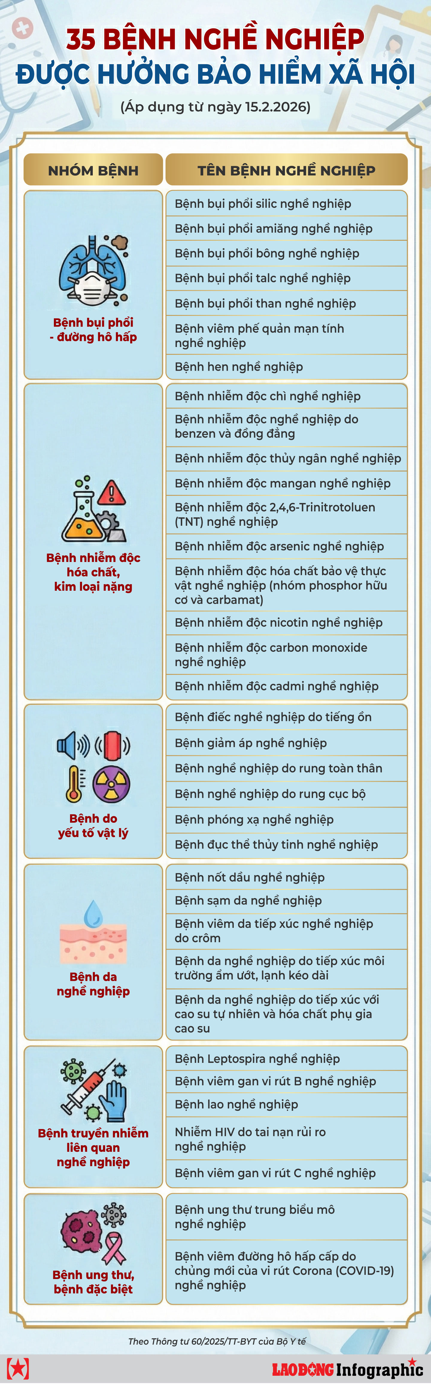 Thông tư 34/2025/TT-BYT của Bộ Y tế quy định danh mục 35 bệnh nghề nghiệp được hưởng bảo hiểm xã hội.