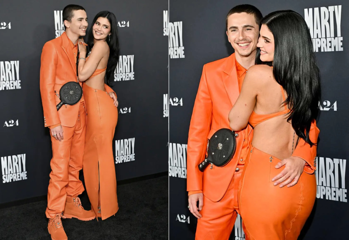 Nữ triệu phú Kylie Jenner và tài tử Timothee Chalame nổi bật với trang phục màu cam tại buổi công chiếu phim 'Marty Supreme' ở Los Angeles, tối 8/12.
