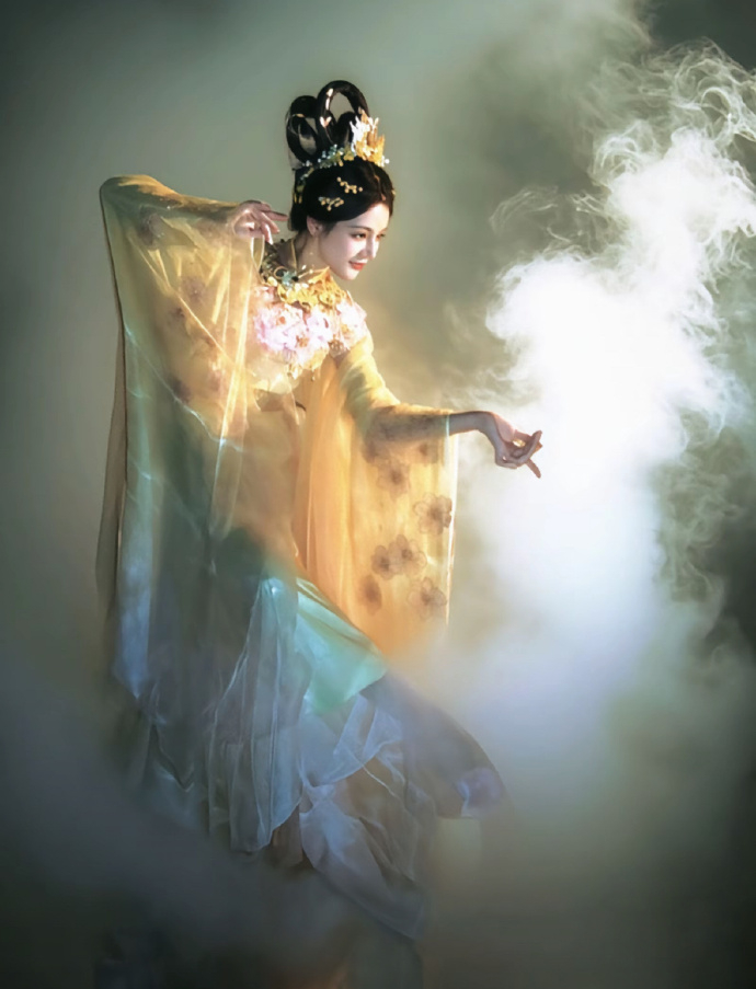 Đạo diễn tiết lộ, Địch Lệ Nhiệt Ba chủ động đề nghị tăng thời lượng treo dây khi thực hiện động tác múa. Cô được treo lên rồi hạ xuống suốt cả một ngày chỉ để đạt được hiệu ứng bay lượn nhẹ nhàng, thoát tục nhất. Những dải lụa mỏng và tay áo rộng tung bay, mô phỏng cánh hoa rơi nhẹ, kết hợp với điệu múa Phi Thiên của Đôn Hoàng, tượng trưng cho ý niệm "mỹ cảm giáo hóa vạn vật, lòng thiện lan tỏa khắp nhân gian". Động tác rải hoa được diễn giải như biểu tượng cho phúc lành trải khắp đất trời và mùa màng bội thu, ẩn chứa hình ảnh thịnh thế an khang.