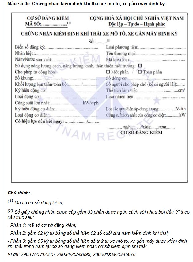 Chứng nhận kiểm định khí thải xe máy định kỳ theo mẫu số 05 Phụ lục XX ban hành kèm theo Thông tư này.