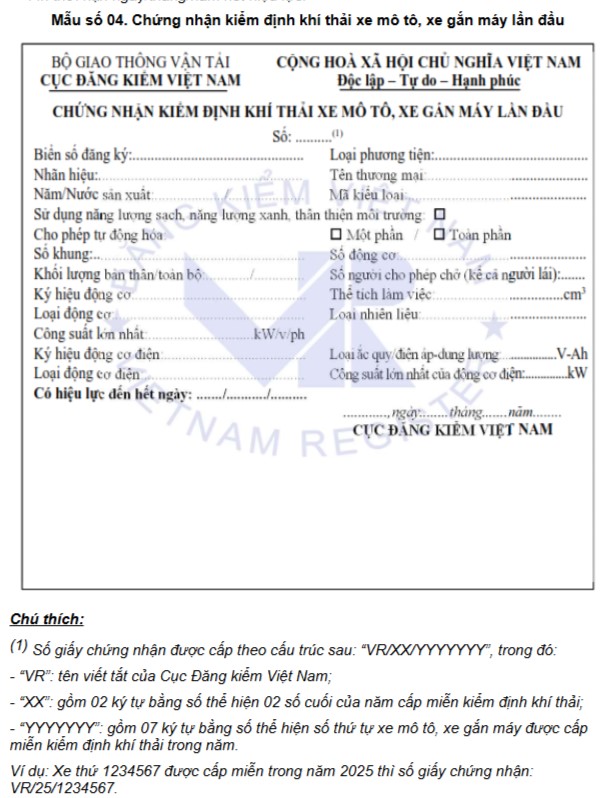Chứng nhận kiểm định khí thải xe máy lần đầu theo mẫu số 04 Phụ lục XX ban hành kèm theo Thông tư này.