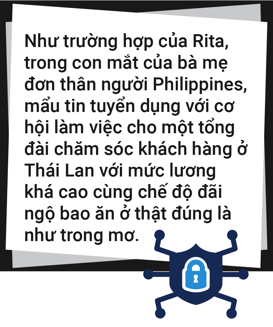 Rita (tên đã thay đổi) - một phụ nữ Philippines từng bị lừa làm việc trong một khu phức hợp lừa đảo trực tuyến ở Myanmar - cho biết cô và các đồng nghiệp được dạy phải chọn nạn nhân giàu nhưng không được quá đẹp.
