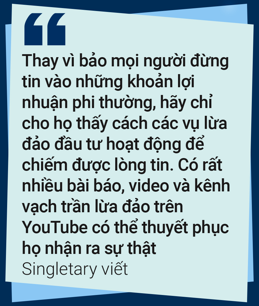 Cách tăng cường cảnh giác tốt hơn, theo Singletary, là "hãy bàn luận về các vụ lừa đảo tài chính thường xuyên như cách chúng ta phàn nàn về chính trị hay bàn về đội thể thao yêu thích của mình".