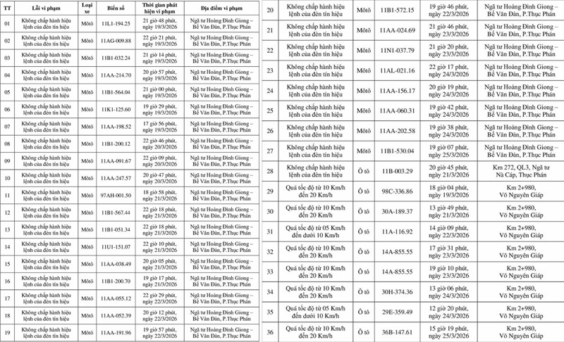 Danh sách các phương tiện vi phạm, bị phạt nguội như sau: