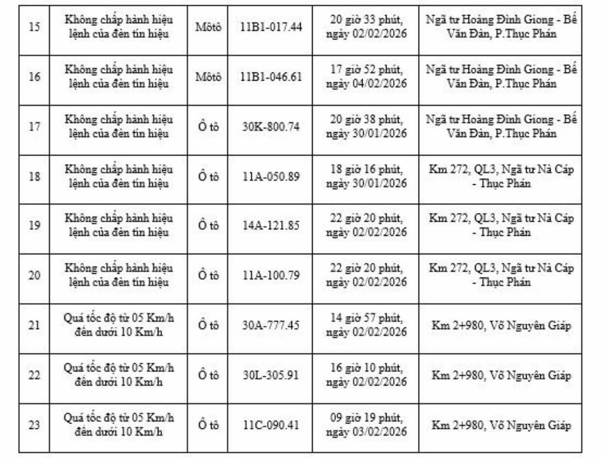 Theo thông báo từ Công an tỉnh Cao Bằng, các trường hợp điều khiển xe ôtô và mô tô vi phạm các lỗi như chạy quá tốc độ quy định, bị phát hiện tại Km2+980, đường Võ Nguyên Giáp và vượt đèn đỏ tại ngã tư Hoàng Đình Giong - Bế Văn Đàn...