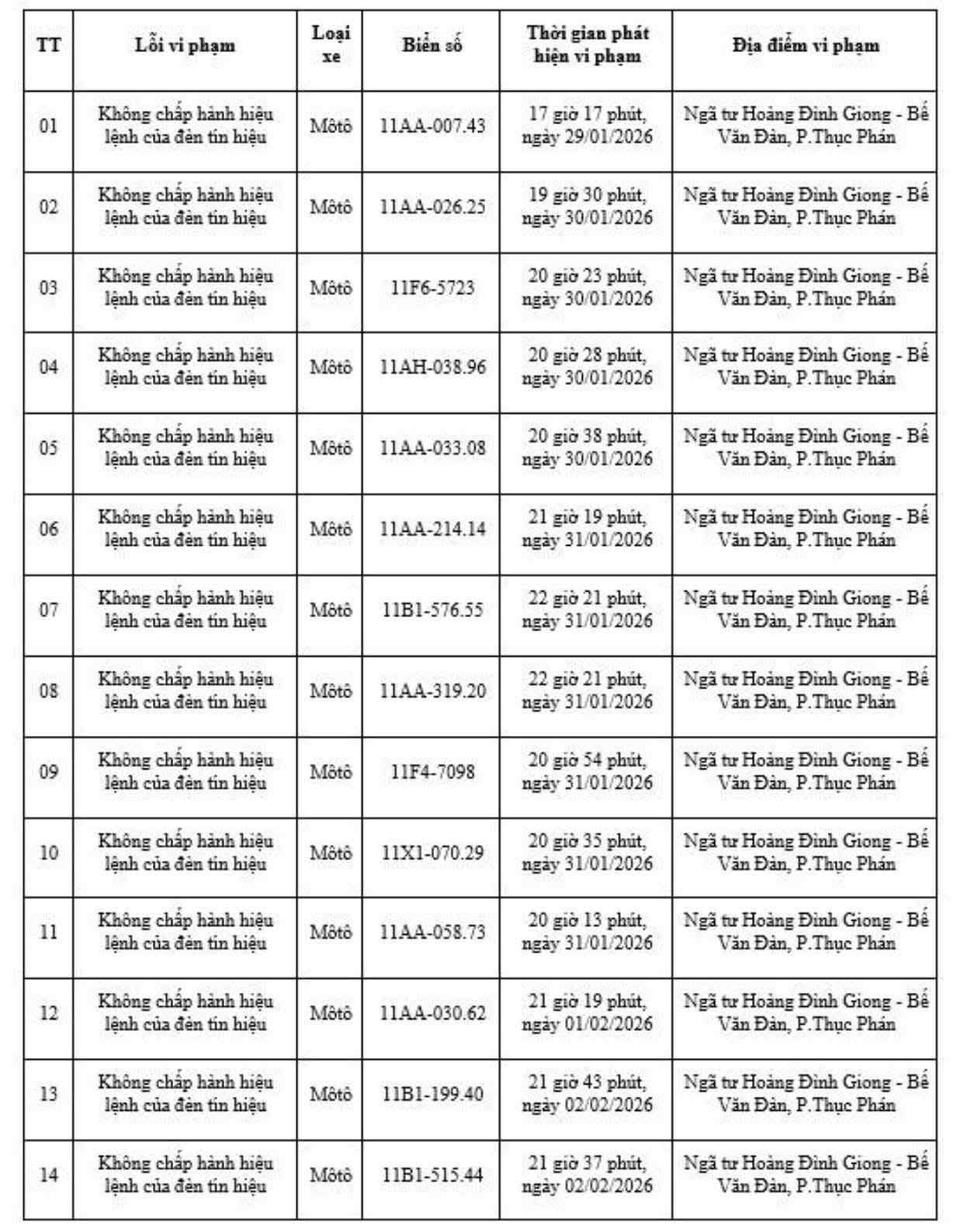Danh sách các phương tiện vi phạm, bị phạt nguội như sau: