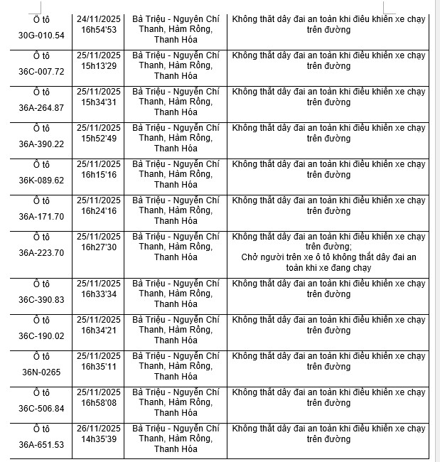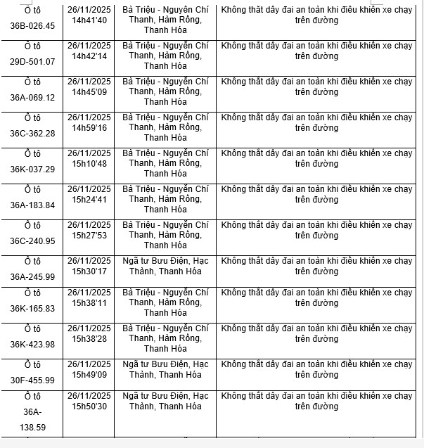 Công an Thanh Hoá thông báo kết quả phát hiện phương tiện vi phạm về trật tự an toàn giao thông qua hệ thống camera giám sát an ninh trật tự, an toàn giao thông (từ ngày 24.11.2025 đến ngày 31.11.2025). Trong số này, nhiều chủ xe bị phạt nguội lỗi không thắt dây an toàn và dùng tay sử dụng điện thoại tiêu biểu như sau: